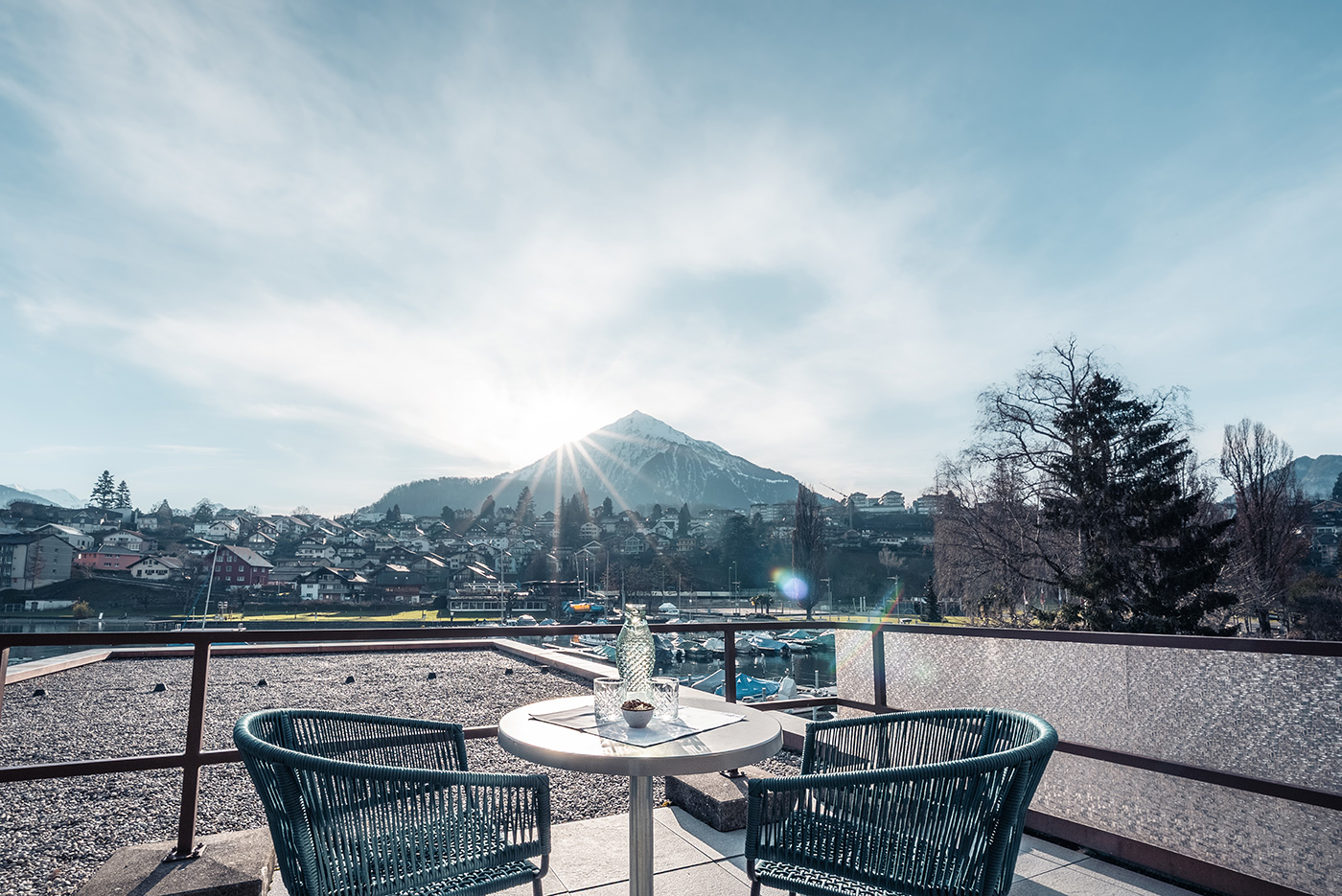 Jedes Zimmer verfügt über einen Balkon mit Tisch und Stühlen, von dem aus Sie einen atemberaubenden Blick auf den Bootshafen, den Hausberg Niesen und die beeindruckende Kulisse der Berner Alpen genießen können. Große Panoramafenster bringen viel Tageslicht in den Raum und öffnen den Blick auf den Niesen – ganz entspannt auch vom Bett oder Sofa aus.