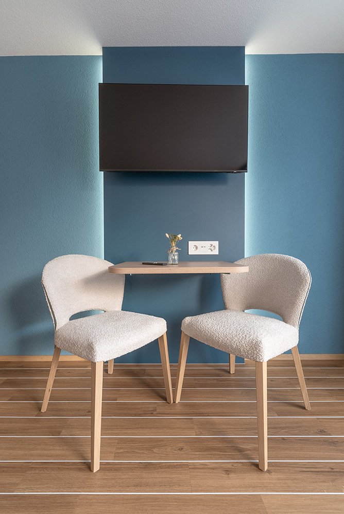 Die Inneneinrichtung spiegelt das maritime Flair der Umgebung wider: Harmonische Blau- und Grüntöne, inspiriert vom schimmernden Wasser des Thunersees. Hochwertige Holzmöbel und ein Boden in Schiffsoptik verleihen dem Raum eine natürliche Eleganz.
